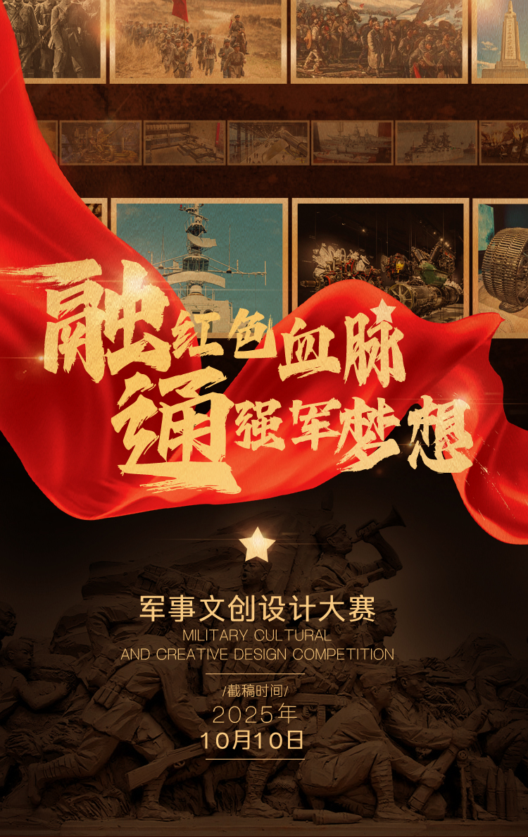 为深入学习贯彻习近平文化思想,进一步繁荣发展强军文化,充分发挥创意设计对军事文创工作的引领带动作用,为迎接建军百年聚能蓄力,特举办“融红色血脉,通强军梦想”军事文创设计大赛。大赛旨在引导青年学子及社会大众在创作实践中体悟军事文化的深厚底蕴,推动红色基因与现代审美有机融合,携手描绘强军兴军的宏伟蓝图。
